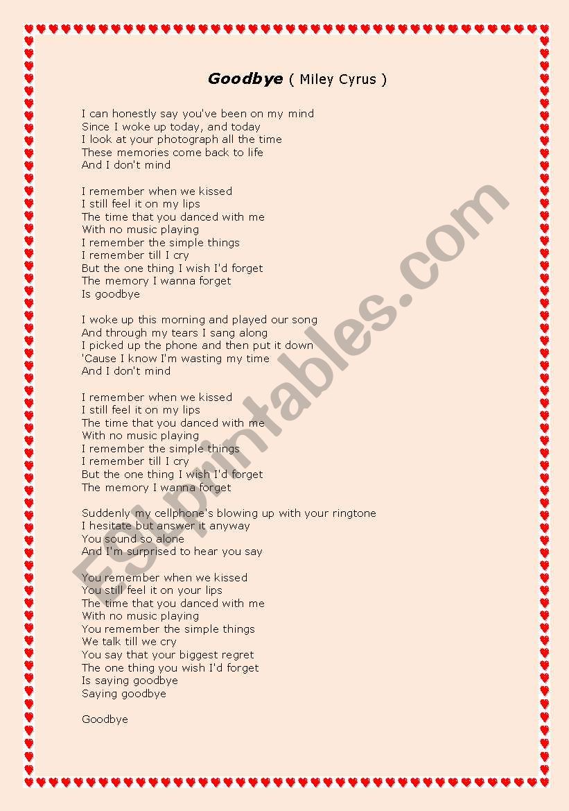 English Worksheets Goodbye Miley Cyrus