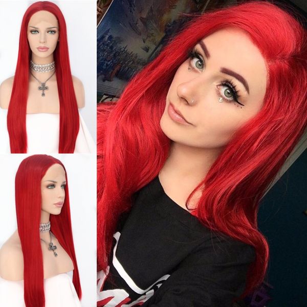 Hot Sexy Handtied High Temperature Fiber Hair Red Color Long Straight Cospaly Wig Heat Resistant Synthetic Lace Front Party Wigs For Women Glueless